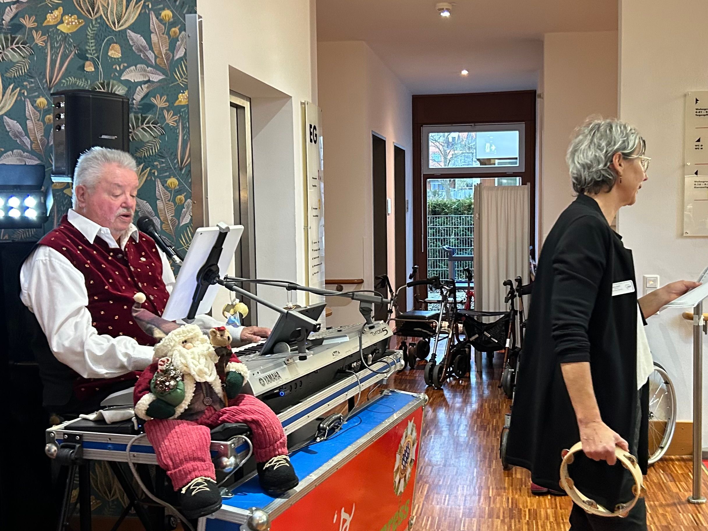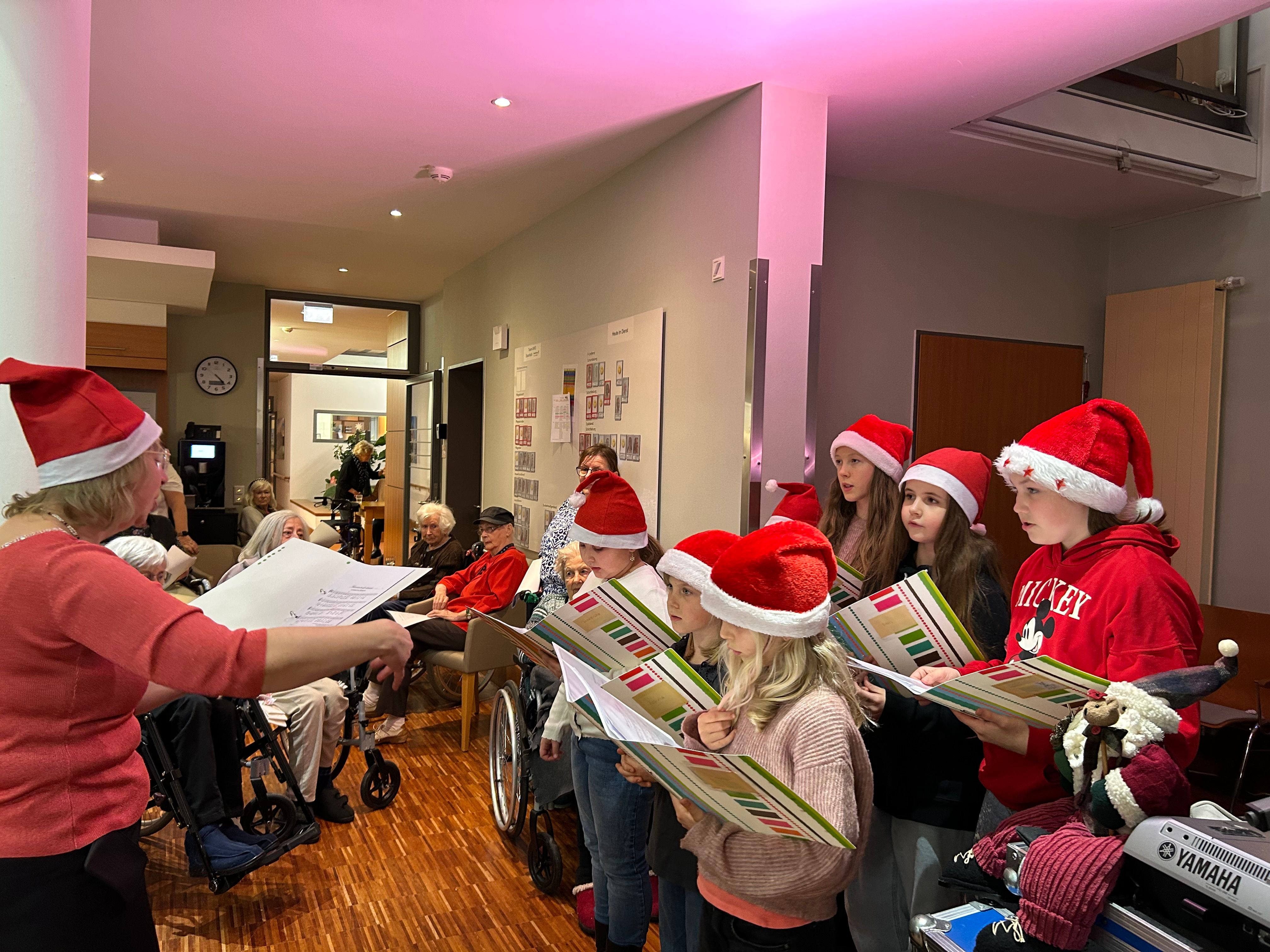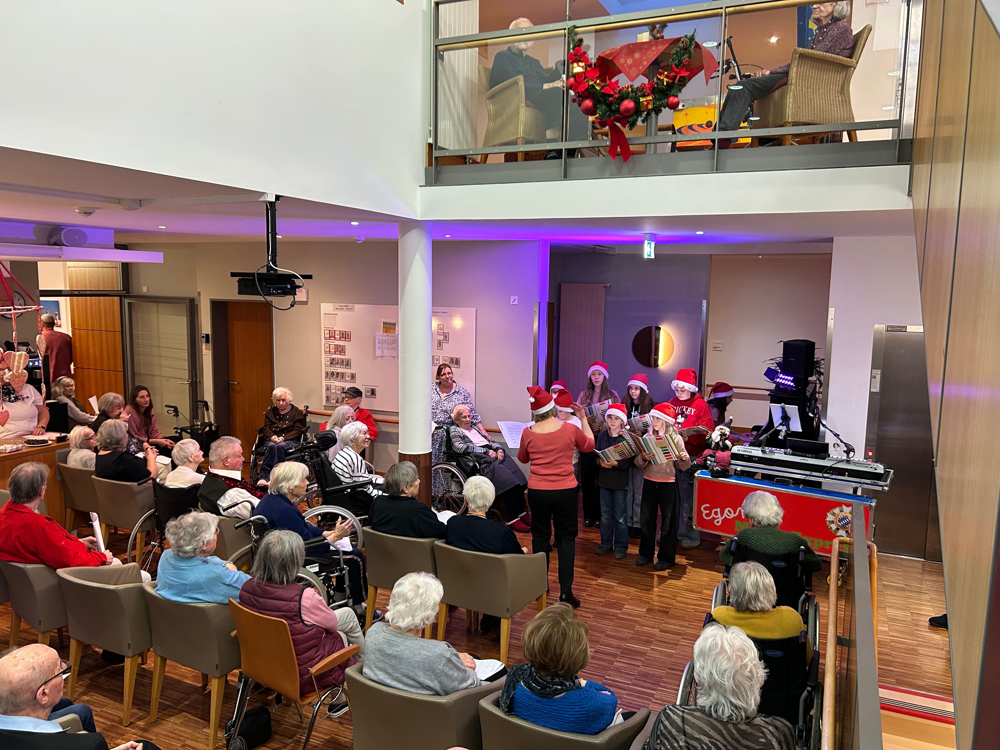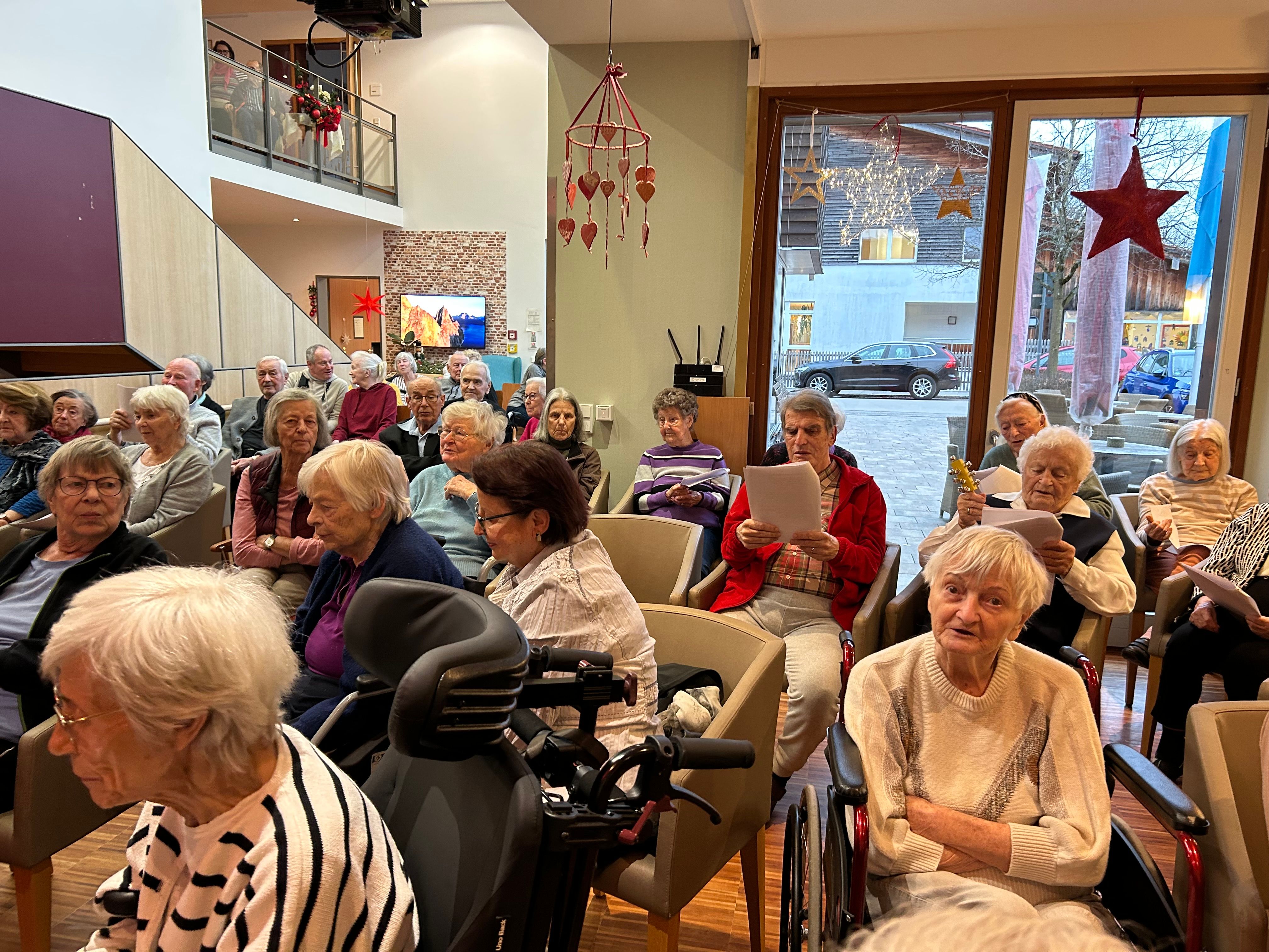 Begonnen hat die Weihnachtsfeier in den Wohngruppen mit Plätzchen, Stollen, Lebkuchen und Kaffee bei heiteren Gesprächen. Später in der Cafeteria wurde es feierlich. Der AWO- Seniorenchor “die Unvergesslichen” und Herr Bätz am Keyboard stimmten uns zum Mitsingen ein, dazu gab es Gedichte, die uns die Bewohner*innen vortrugen. Außerdem waren die “Goldkehlchen” mit Frau Joos und frohen Weihnachtsliedern zu Gast. In der Pause gab es Glühwein/Punsch und selbstgebackene Waffeln. Zudem konnte man am Weihnachtsstand ein kleines Weihnachtsgeschenk (von den Senior*innen und Betreuungsassistent*innen selbstgebastelt) kaufen. Das Highlight des Abends war Familie Lederer mit Frau Lederer an der Klarinette, Julia an der Harfe und Benedikt an der „steirischen Harmonika“