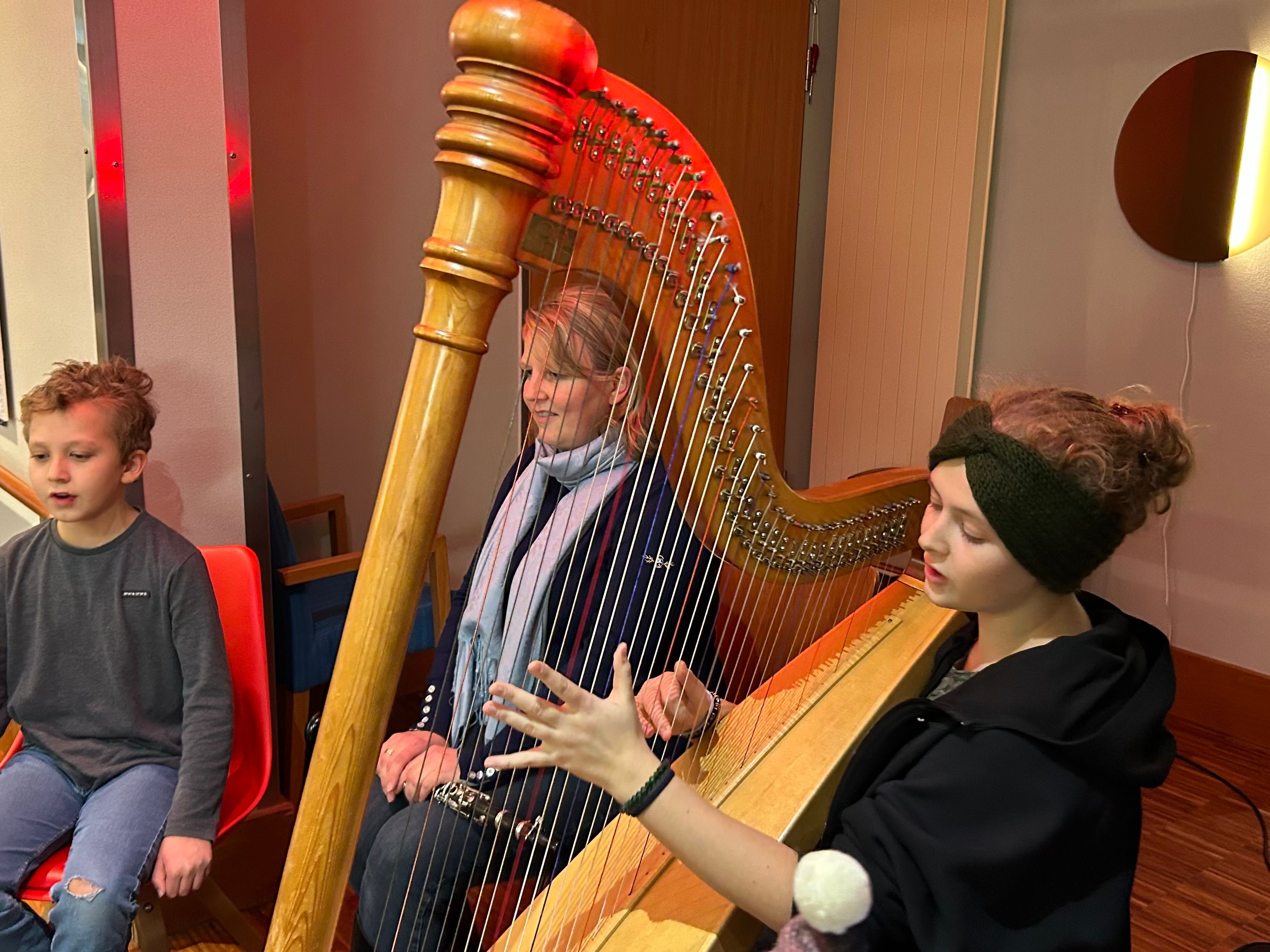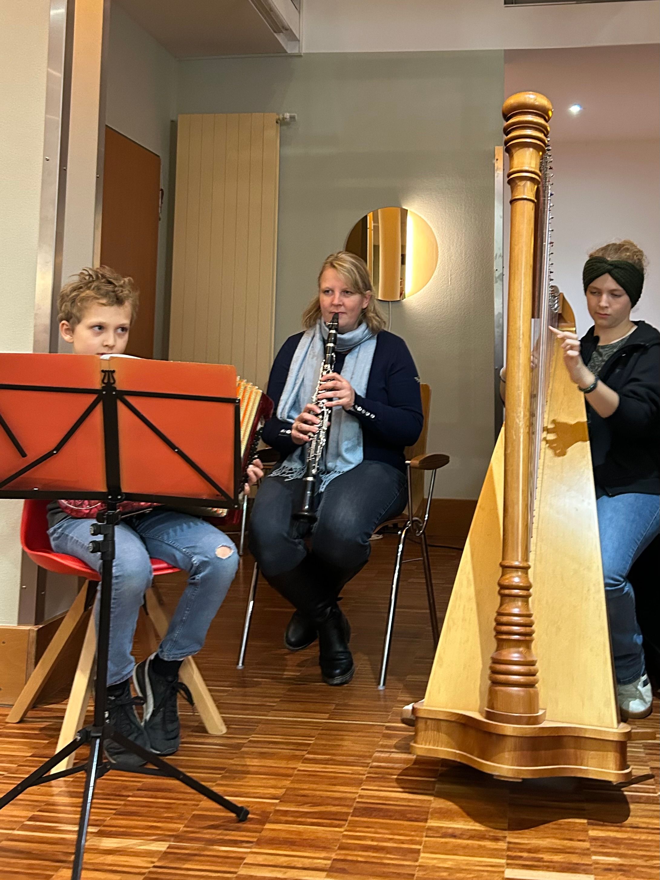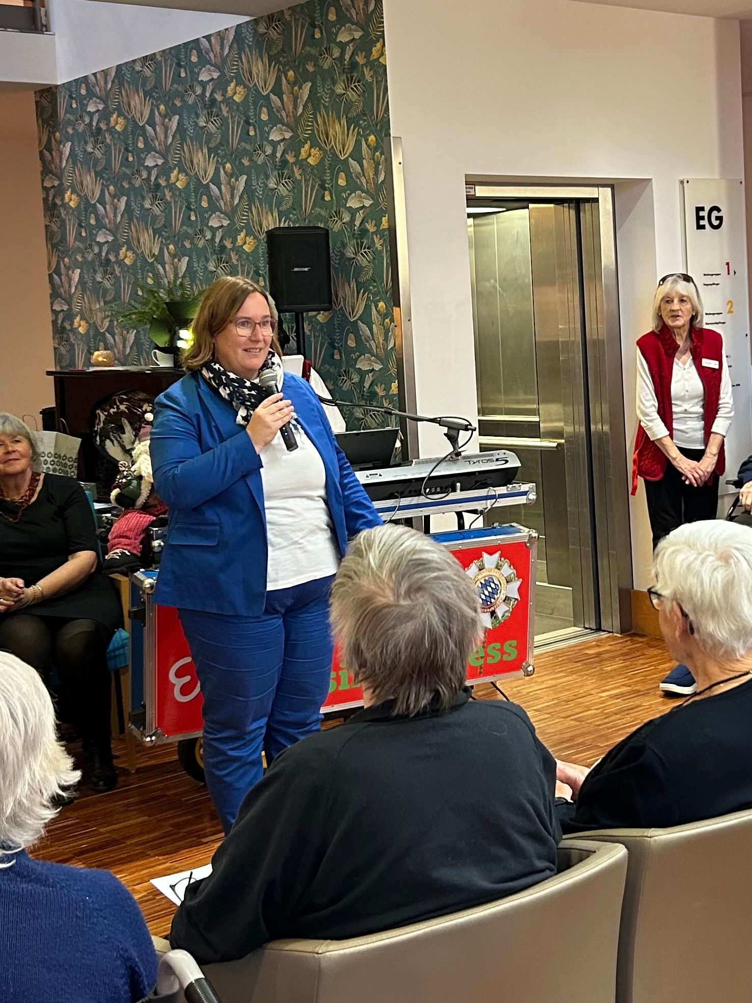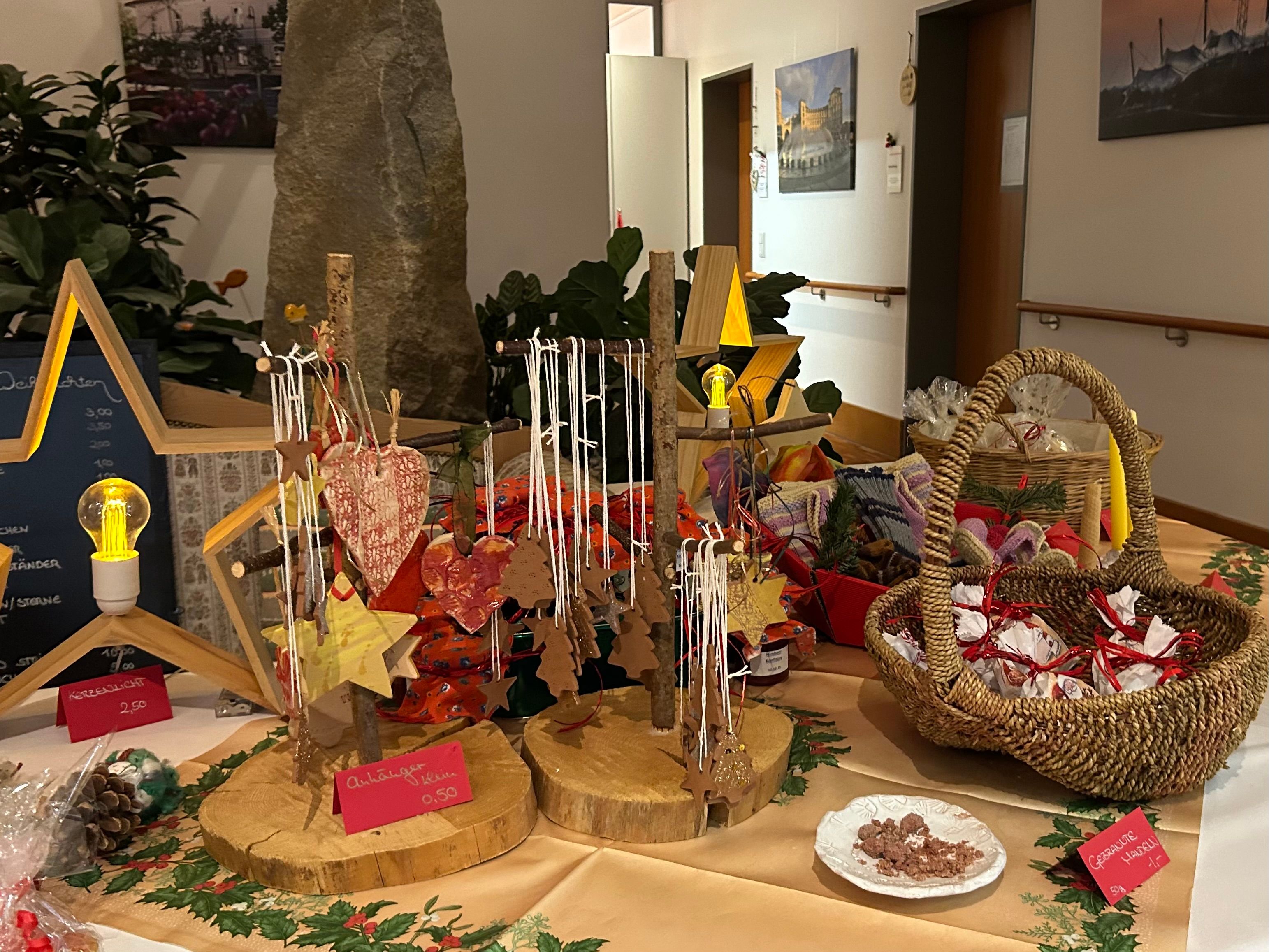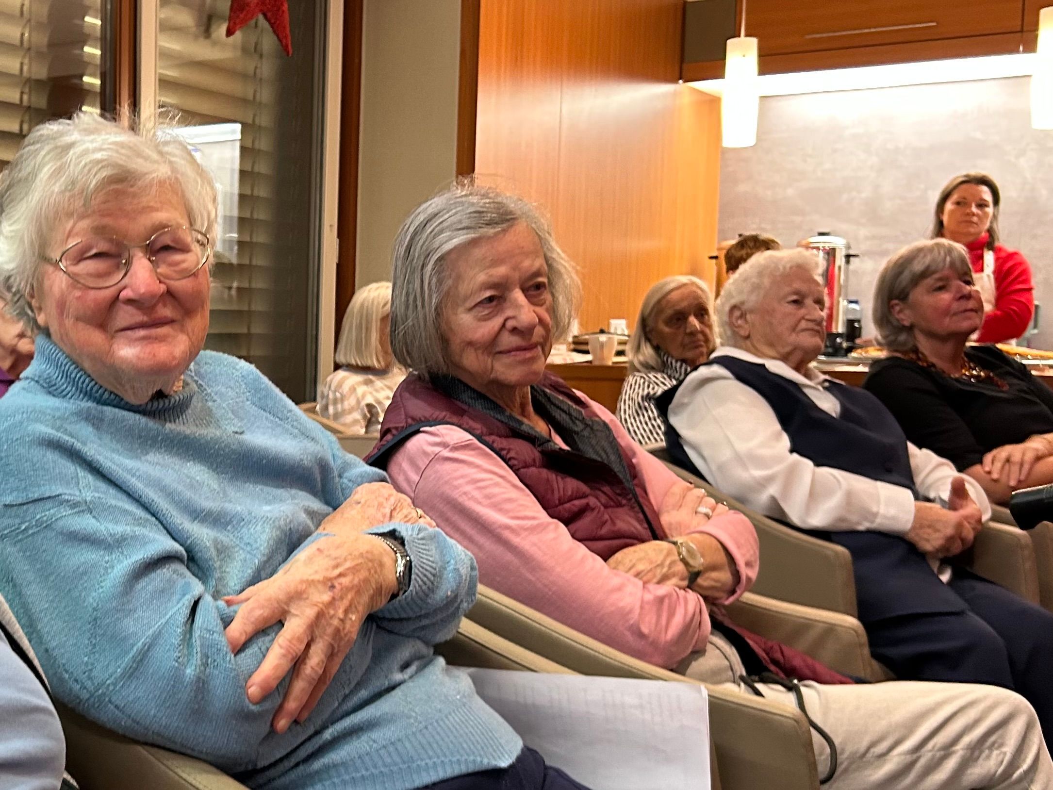 Begonnen hat die Weihnachtsfeier in den Wohngruppen mit Plätzchen, Stollen, Lebkuchen und Kaffee bei heiteren Gesprächen. Später in der Cafeteria wurde es feierlich. Der AWO- Seniorenchor “die Unvergesslichen” und Herr Bätz am Keyboard stimmten uns zum Mitsingen ein, dazu gab es Gedichte, die uns die Bewohner*innen vortrugen. Außerdem waren die “Goldkehlchen” mit Frau Joos und frohen Weihnachtsliedern zu Gast. In der Pause gab es Glühwein/Punsch und selbstgebackene Waffeln. Zudem konnte man am Weihnachtsstand ein kleines Weihnachtsgeschenk (von den Senior*innen und Betreuungsassistent*innen selbstgebastelt) kaufen. Das Highlight des Abends war Familie Lederer mit Frau Lederer an der Klarinette, Julia an der Harfe und Benedikt an der „steirischen Harmonika“